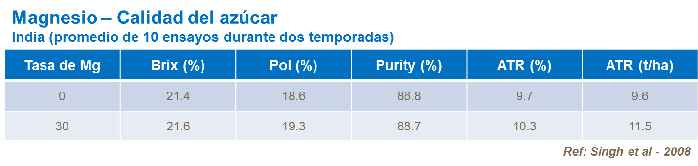 Suministros de magnesio ayudan en mantener el contenido de sacarosa en la caña por fomentar la síntesis de proteínas a la vez que mejora la calidad de jugo.