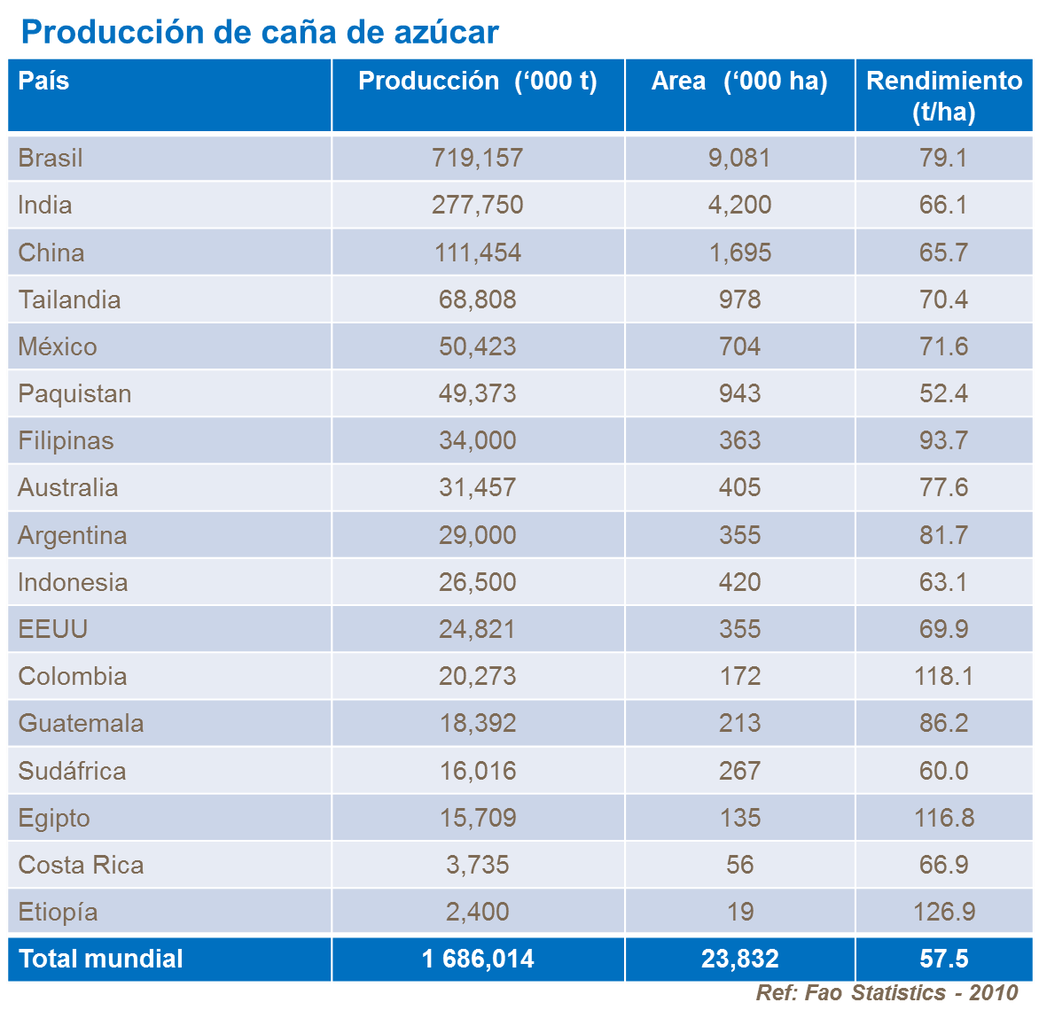 Esto sumado a las cifras de India y China da como resultado que los tres países son responsables de dos tercios de la producción mundial de caña de azúcar en un área de casi 15 millones de hectáreas. Los factores climáticos, en particular el abastecimiento de agua, son los que más influyen en la producción.