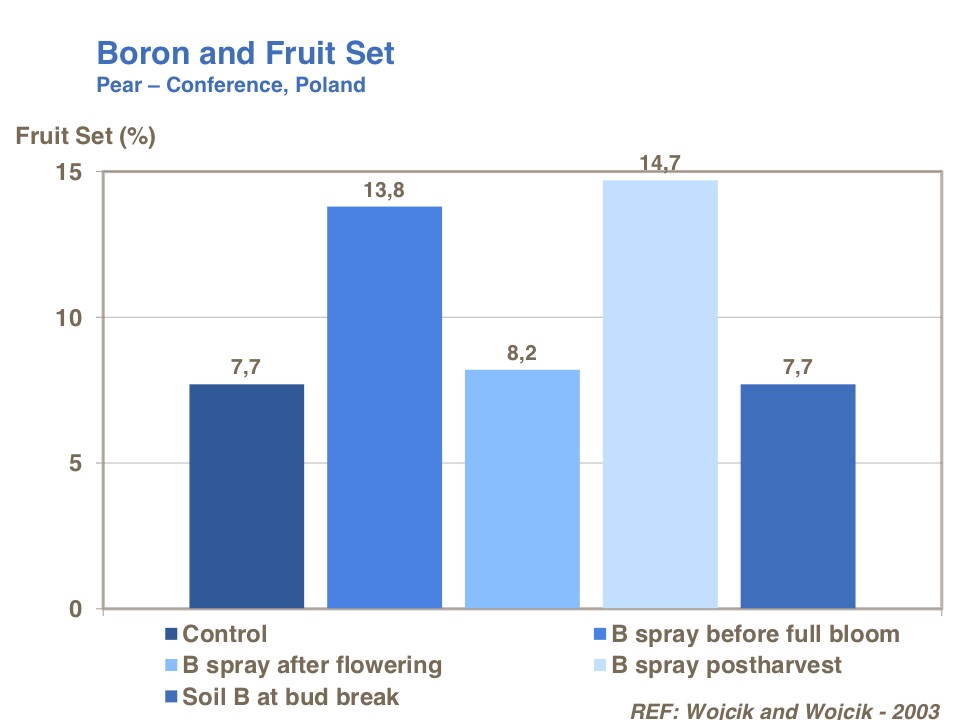 Como el boro no se mueve con facilidad dentro del árbol, se usa más en aplicaciones foliares durante los periodos clave de formación de flores y frutos para mantener el buen cuajado de frutos.